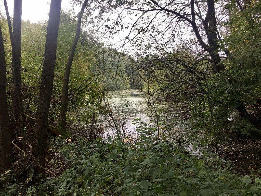 Schließlich erreicht man den kleinen Hummelsee (siehe Wikipedia), dem man seine künstliche Entstehung auf den ersten Blick gar nicht ansieht. Üppiger Baumbestand säumt seine Ufer. Dennoch handelt es sich beim Hummelsee um eine ehemalige Kiesgrube, die nur zum Teil wieder verfüllt wurde. Heute ist er bis zu 9 m tief.
