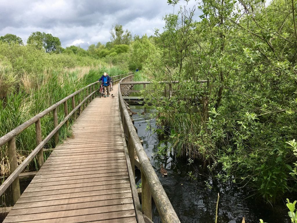 Wenig später führt die Fahrradtour auf einen Campingplatz und kurz drauf in ein kleines, sehenswertes Feuchtgebiet, das man auf einem Holzsteg durchfährt. Hier ruhig einmal absteigen und die Natur auf sich wirken lassen!