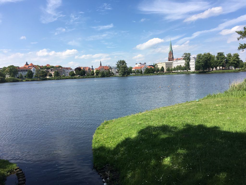 Bis zur Schweriner Innenstadt sind es nun noch wenige Kilometer, die man am besten entlang der Gadebuscher und Lübecker Straße radelt. Erstes Ziel ist der Pfaffenteich im Zentrum Schwerins, an dessen Ufer sich eine erste Rast anbietet.