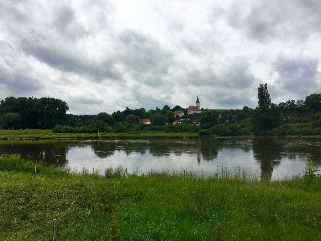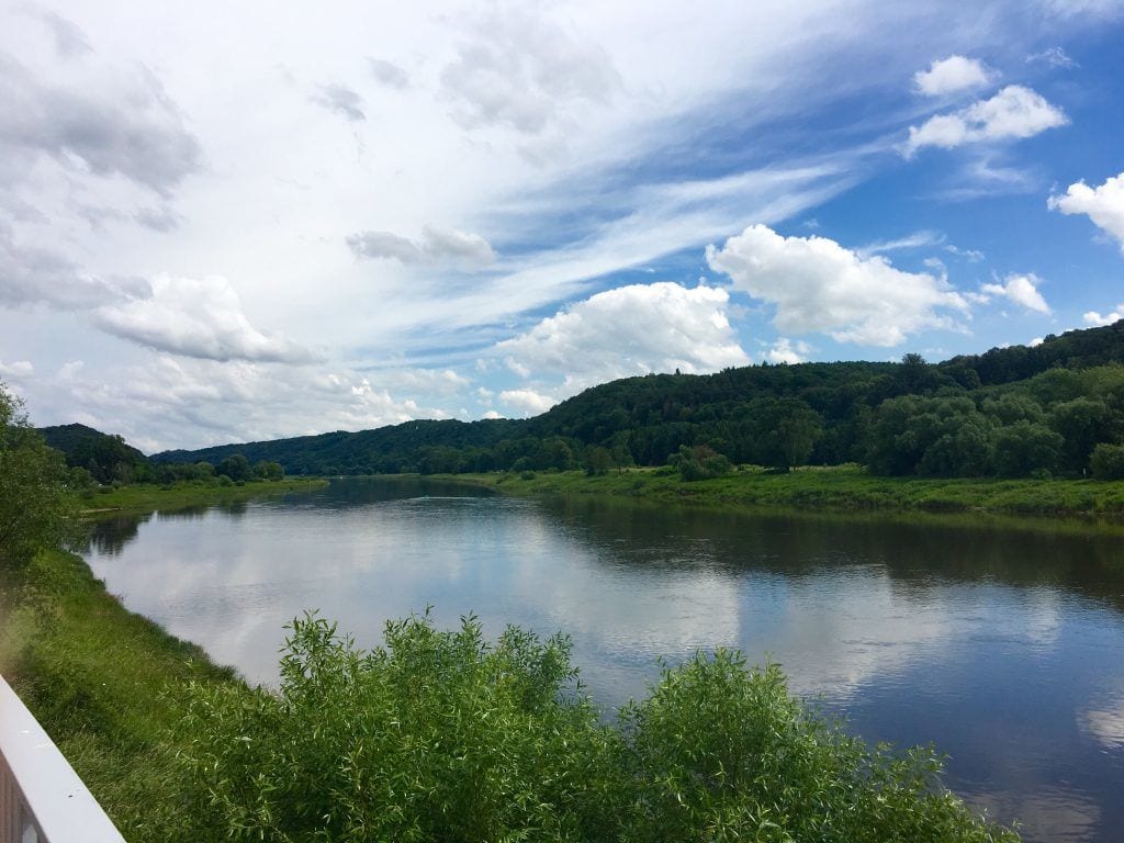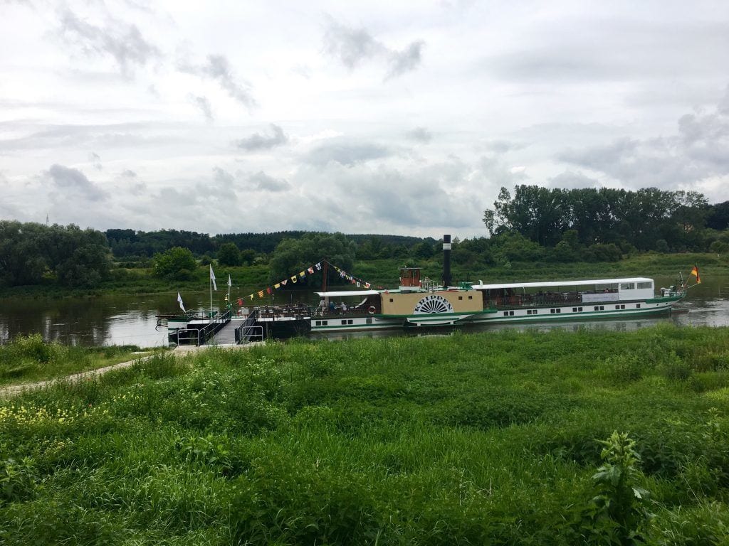 Über die Altstadtbrücke radelt man zurück an das Ostufer der Elbe und anschließend weiter in südliche Richtung. Dicht am Fluss geht es durch eine sattgrüne Auenlandschaft, umrahmt von bewaldeten Hängen. Mit Glück sieht man einen der typischen Raddampfer auf der Elbe schippern oder hört dessen Pfeiffen schon aus der Ferne.