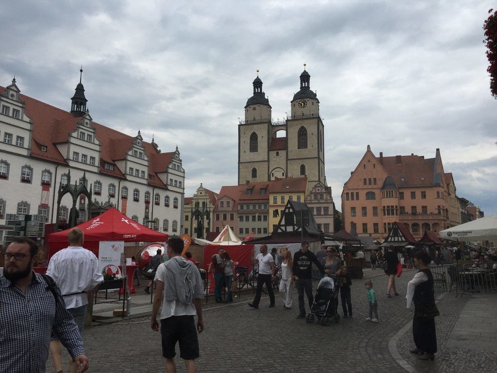 Ich war überwältigt: Selten habe ich im Osten Deutschlands eine so lebendige und hübsche Altstadt gesehen, wie an diesem Junisonntag in der Lutherstadt Wittenberg (siehe Wikipedia)! Das an diesem Tag stattfindende Altstadtfest tat sein übriges. Überall mittelalterlich gekleidete, fröhliche Menschen, bunte Marktstände, Grillgeruch, Stockbrot, Musik vor einer architektonisch wirklich beeindruckenden Altstadtkulisse.