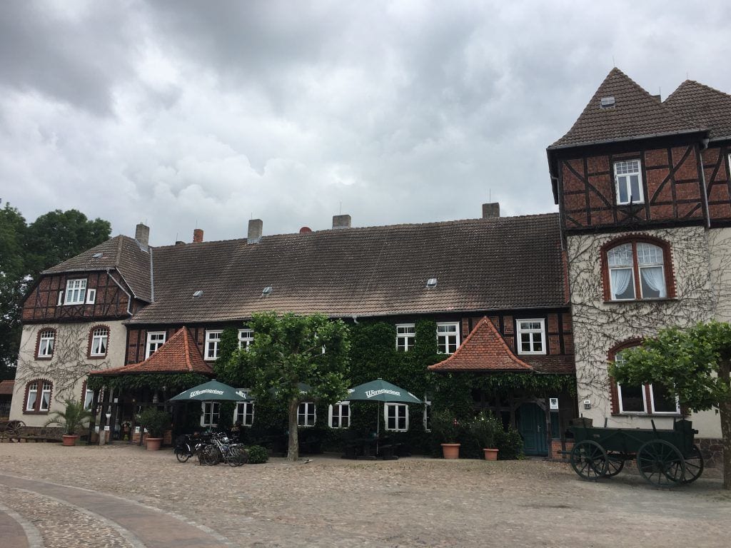 Auf der Westseite der Elbe angekommen, verläuft der Elberadweg nun auf dem Elbdeich, vorbei am Örtchen Räbel, südwärts. Wegen Bauarbeiten am Deich, musste ich 2016 etwa 4 km hinter Räbel den Weg in Richtung westliches Elbvorland verlassen und über die dortigen Dörfer Sandauerholz und Büttnershof radeln. Im Letzteren bietet sich am dortigen, imposanten Gutshaus (Karte[4]) eine erste Rast an, Kaffee gibt´s dort auf jeden Fall!