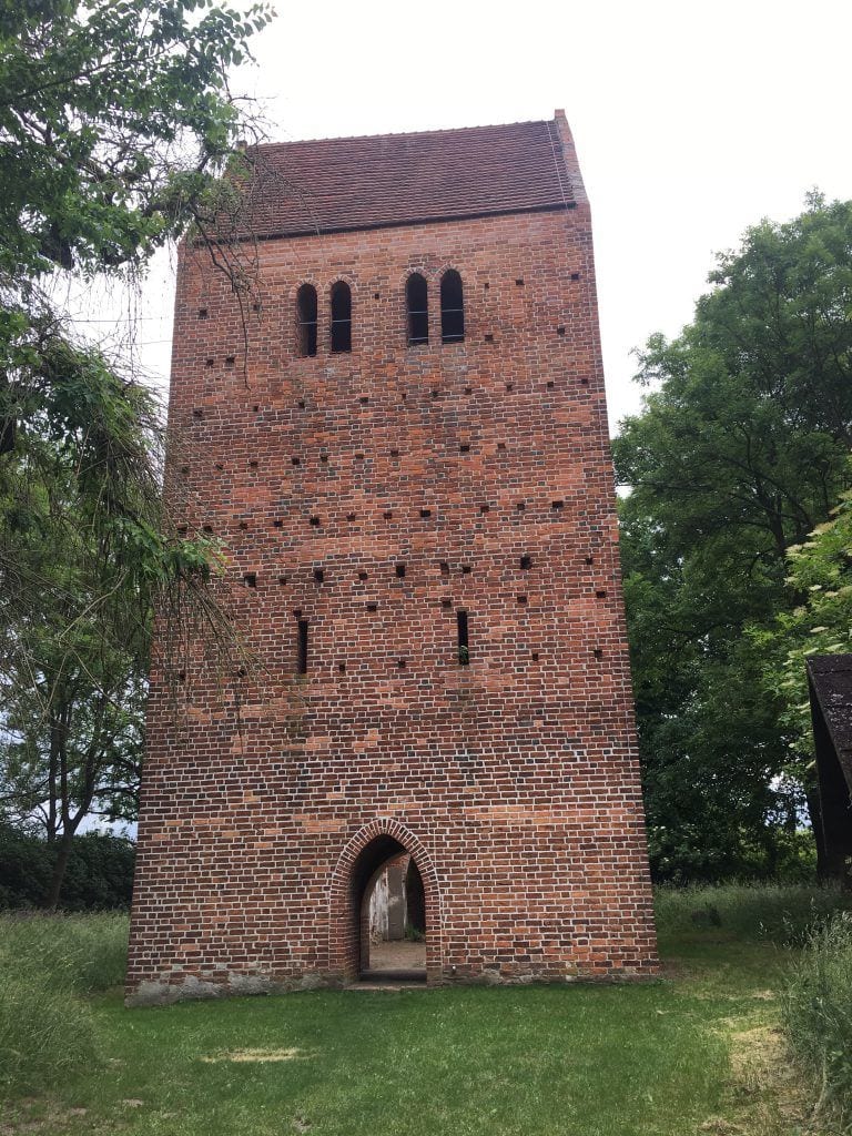 Knapp 1,5 km hinter Büttnershof, kommt man dann an der alten Kirchenruine Käcklitz (Karte[5]) vorbei. Mitten in der flachen Landschaft, steht hier plötzlich diese ehemalige Dorfkirche aus dem 15. Jahrhundert. Nur von ihrem Dorf – Käcklitz – ist nichts mehr zu sehen, denn dies wurde Mitte des 20. Jahrhunderts von seinen Bewohnern aufgegeben. 1968 fand hier der letzte Gottesdienst statt. Den Turm der alten Kirche kann man erklimmen, was allein etwas gruselig, aber auch interessant ist.