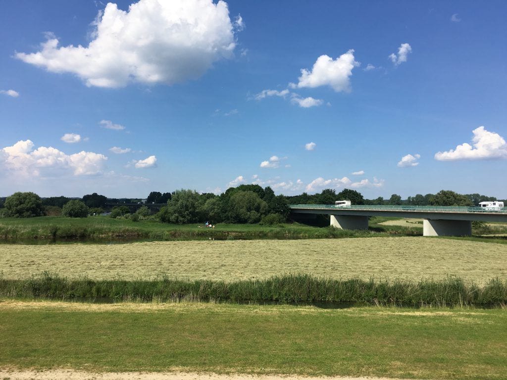 Links und rechts des Weges, wechseln sich nun Vierländer Gemüsefelder mit sattgrünen Wiesen und Weiden ab. Das Gelände hier ist flach und leicht zu durchfahren. Für mich war es ein guter und sanfter Einstieg in die Etappe.
