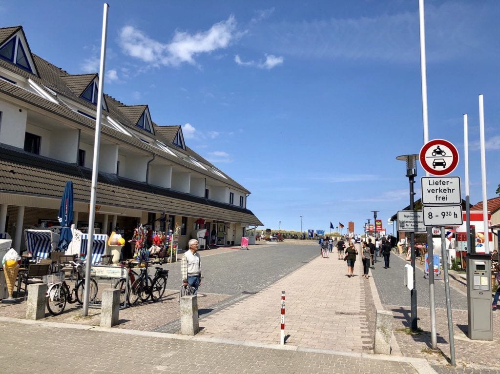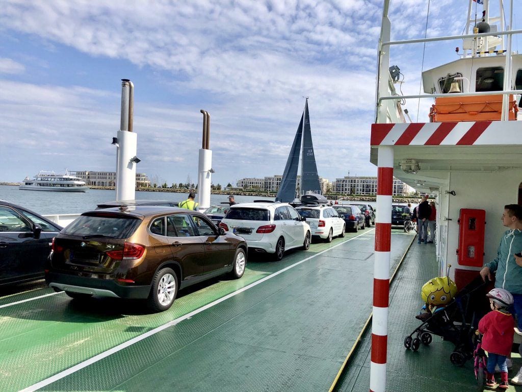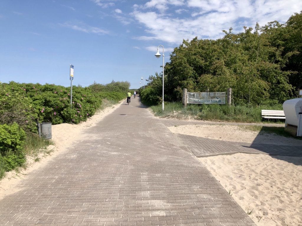 Die Fähre bringt einen dann hinüber in den Ortsteil Hohe Düne, wo die Fahrradtour endlich richtig startet. Die Strecke ist gut mit regelmäßigen Fahrradwegweisern sowie dem Logo des Ostsee-Küsten-Radweges gekennzeichnet, dem man ab jetzt folgt. Vorbei am Marinestützpunkt Hohe Düne zur Rechten, geht es jetzt ostwärts auf dem Radweg neben der Straße.