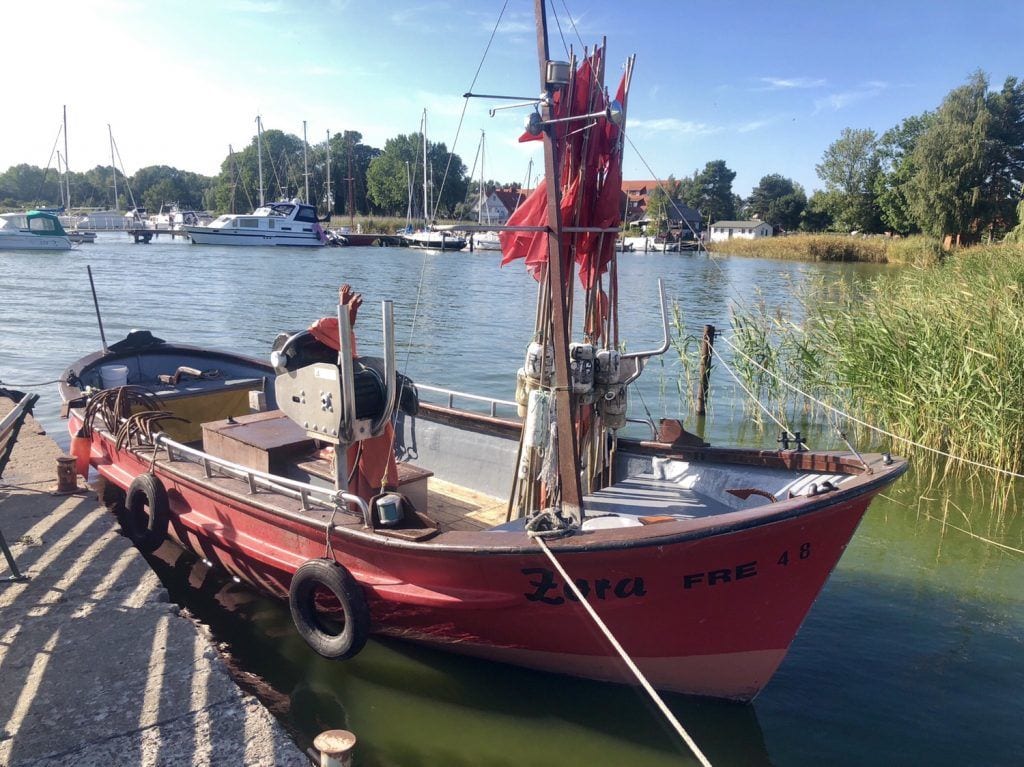Auch ein Abstecher zum kleinen Hafen lohnt sich, bevor wir Krummin über die Dorfstraße in Richtung Südwesten verlassen. Eine Landstraße führt uns vorbei an Feldern und einem kleinen Gehöfft. Nach etwa 10 Minuten erreichen wir den kleinen Ort Neeberg, der gleich am Ortseingang ein uriges Fischrestaurant zu bieten hat. Einen Abstecher zum kleinen Hafen kann man auch hier machen, noch etwas idyllischer wird es allerdings weiter westlich in Ziemitz.
