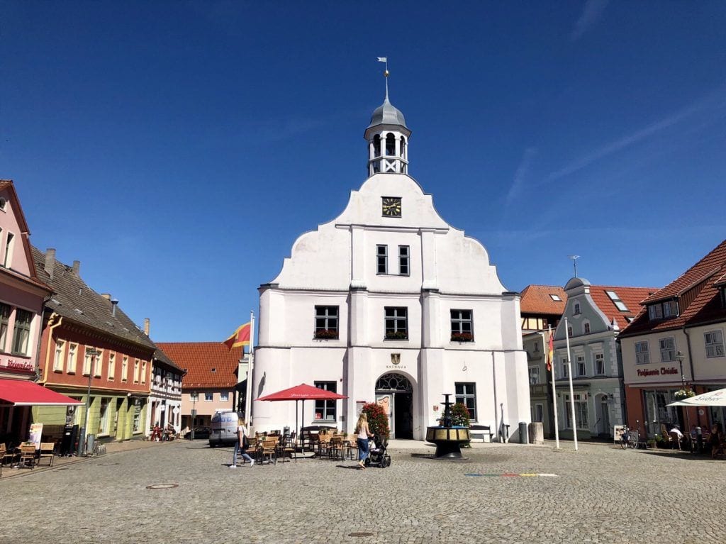 Wir starten diese Fahrradtour am besten am Brunnen vor dem historischen, barocken Rathaus auf dem schönen Rathausplatz von Wolgast. Darin befindet sich heute die Touristeninformation und das Standesamt, die eigentliche Stadtverwaltung findet hier heute nicht mehr statt.