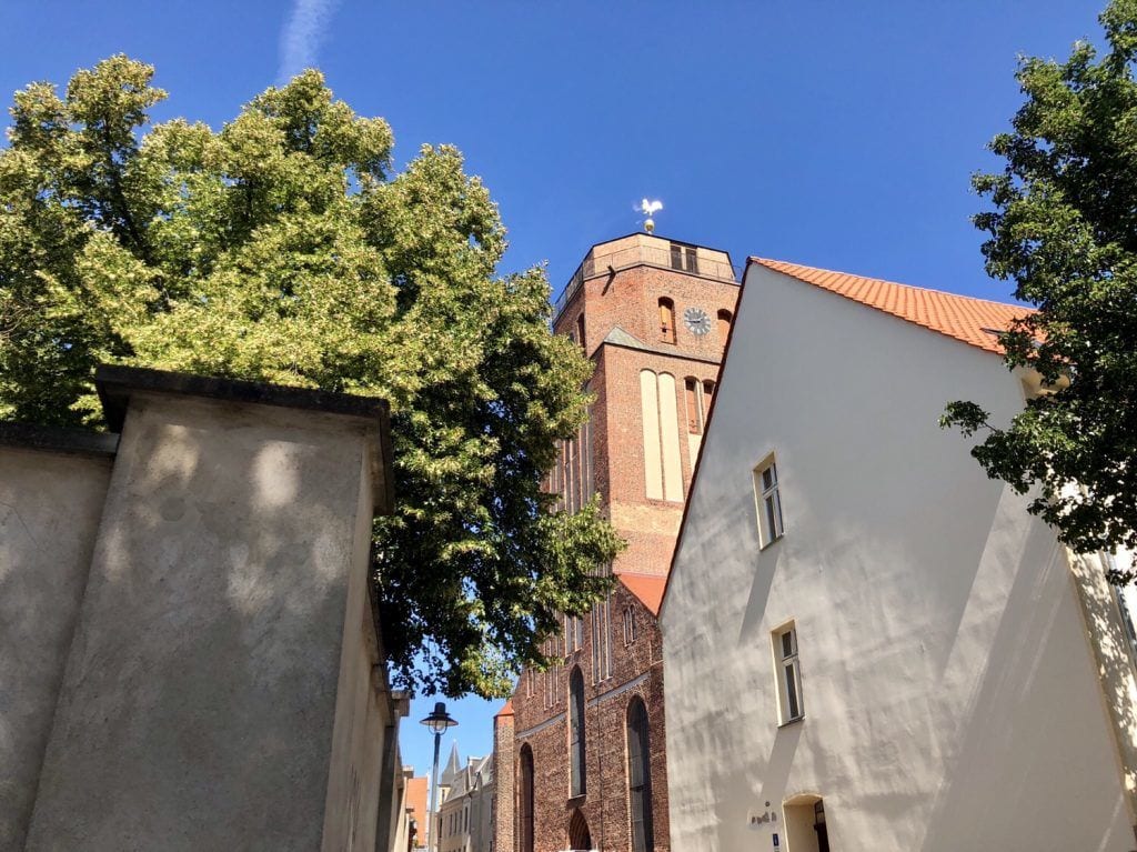 Markant ist die wuchtige Petrikirche, die man jetzt im Rücken hat. Dieser fehlt seit einem Brand im Jahre 1920 die eigentliche Spitze. Eine Besteigung zur dortigen Aussichtsplattform in 40 m Höhe ist ein lohnenswertes Unterfangen. Denn von dort oben hat man doch eine grandiose Aussicht auf das Wolgaster Umland. Die Kleinstadt, übrigens meine Heimatstadt, wird auch als „Tor zur Insel Usedom“ bezeichnet. Denn ein Großteil des Verkehrs zur Insel muss vorher durch Wolgast hindurch.