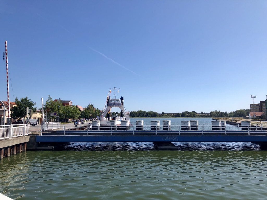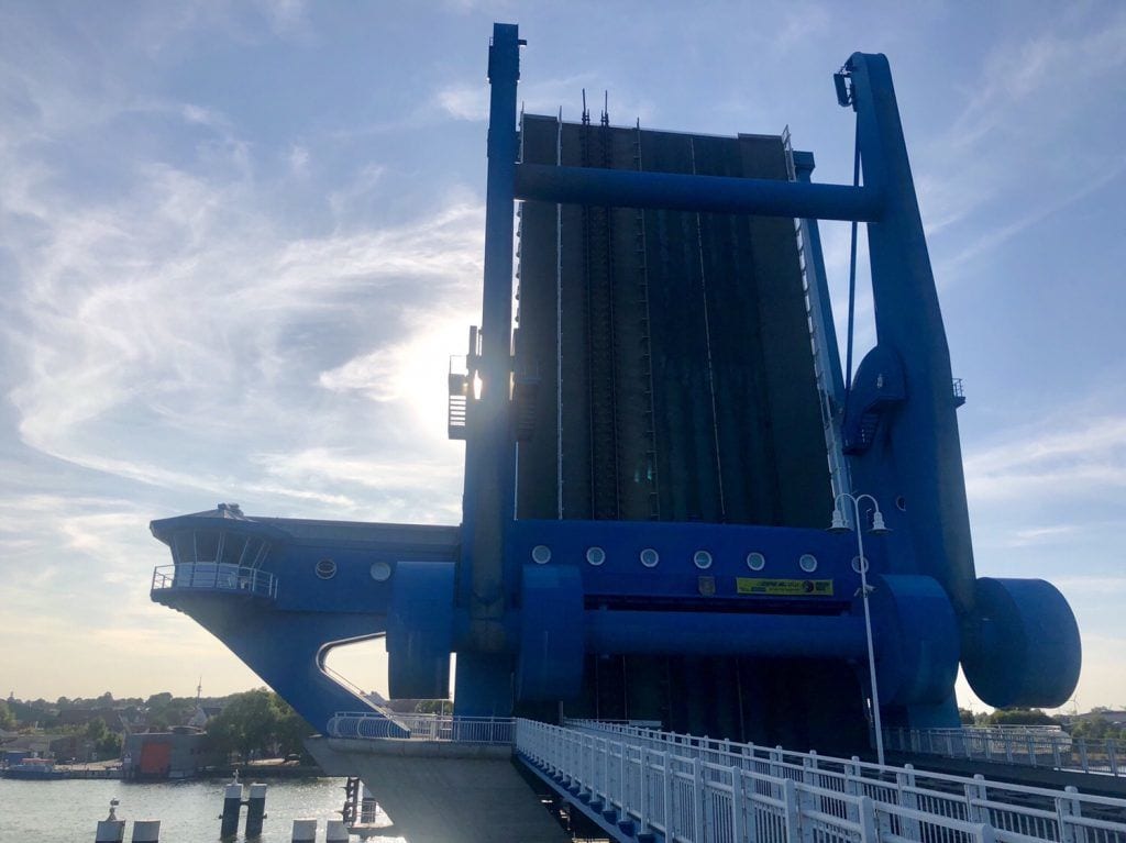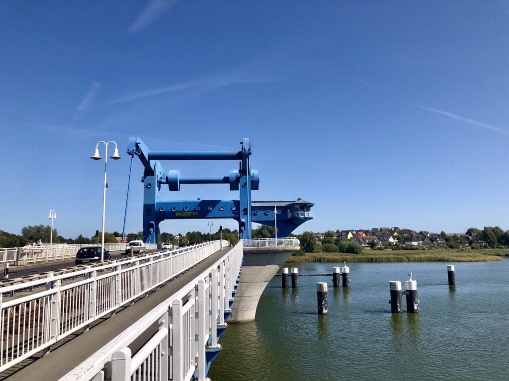 Wir folgen dem Radweg nach links auf die Peenebrücke, die insbesondere beim „Brückenzug“, also der regelmäßigen Öffnung, einen spektakulären Anblick bietet. Der Pkw- und Personenverkehr kommt dann für etwa 20-30 min zum Erliegen und in den Wolgaster Hafen ein- oder ausfahrende Segler haben dann Vorrang.
