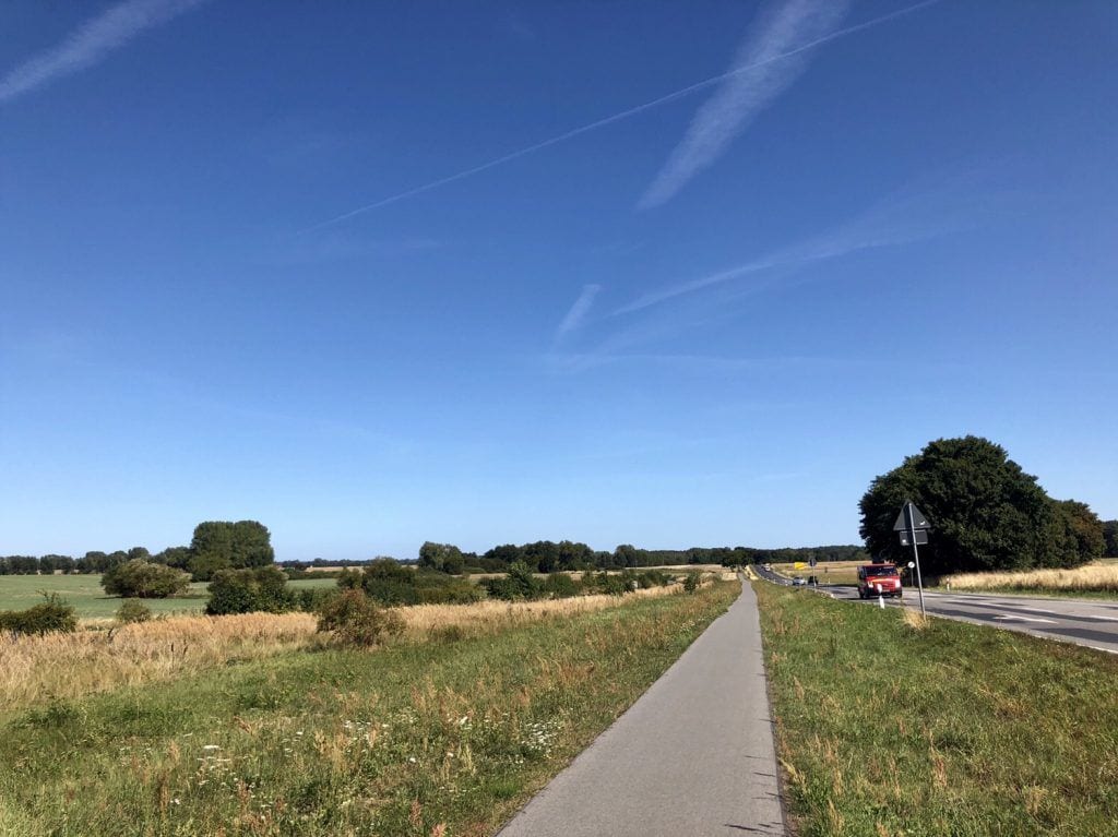 An der Tankstelle wechseln wir die Fahrbahnseite, da dort der Radweg in Richtung der Inselorte Zinnowitz und Ahlbeck verläuft. Nun geht es für etwa 2 km parallel zur Bundesstraße B111 voran, was ein landschaftlich schöner, allerdings auch der lauteste Abschnitt der Fahrradtour ist.