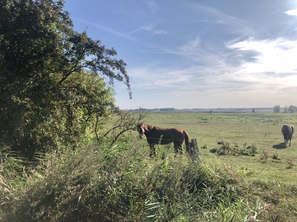 Wir folgen dem Weg, der nach etwa 800 m scharf nach links abbiegt. Mit Glück erspähen wir einige Pferde, die auf der angrenzenden Koppel stehen und zum vor uns liegenden Reiterhof gehören.