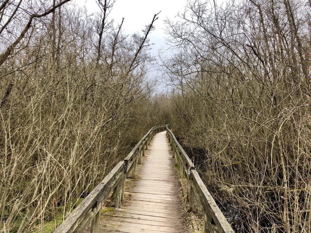 Über Wurzeln und durch Pfuhle hindurch, ackerst Du Dich voran. Vielleicht drehst Du hier noch eine Extrarunde? Nur zu! Gleich im Anschluss folgt der spannende Holzpfad des „Stellmoor-Ahrensburger Tunneltals“, links und rechts von Dir nur Sumpf, abgestorbenes Holz und Morast.