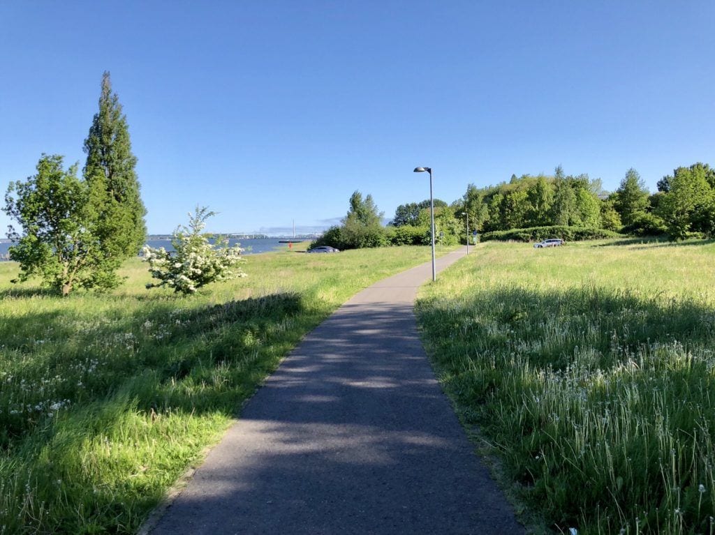 Schließlich geht es nun am Strelasund entlang südwärts in Richtung der Hansestadt Stralsund. Der Weg führt dabei unmittelbar über der Uferböschung des Sunds entlang und bietet immer wieder schöne Ansichten auf die Stadt.