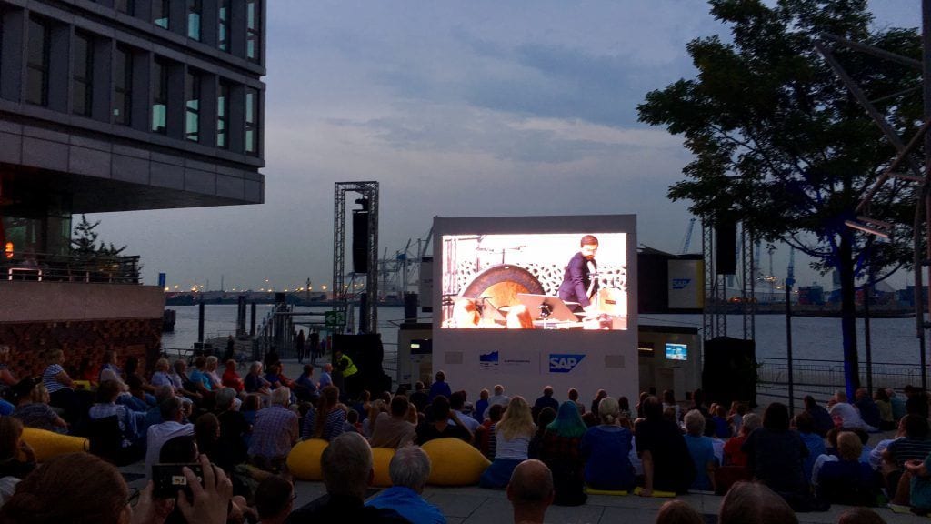 Trotzdem habe ich gestern ein Konzert der Elbphilharmonie miterlebt. Und zwar kostenlos und draußen, bei 25 °C und Hamburger Sommerwetter (also grauem Himmel ;). Und Du kannst das auch noch bis 31.8.17 im Rahmen des „Elbphilharmonie Sommers“. Direkt vor der Elphi am Fähranleger sitzt man bequem auf Sitzkissen vor einem riesigen Bildschirm und lauscht live dem Konzert, das von drinnen übertragen wird. Schöne Atmosphäre!