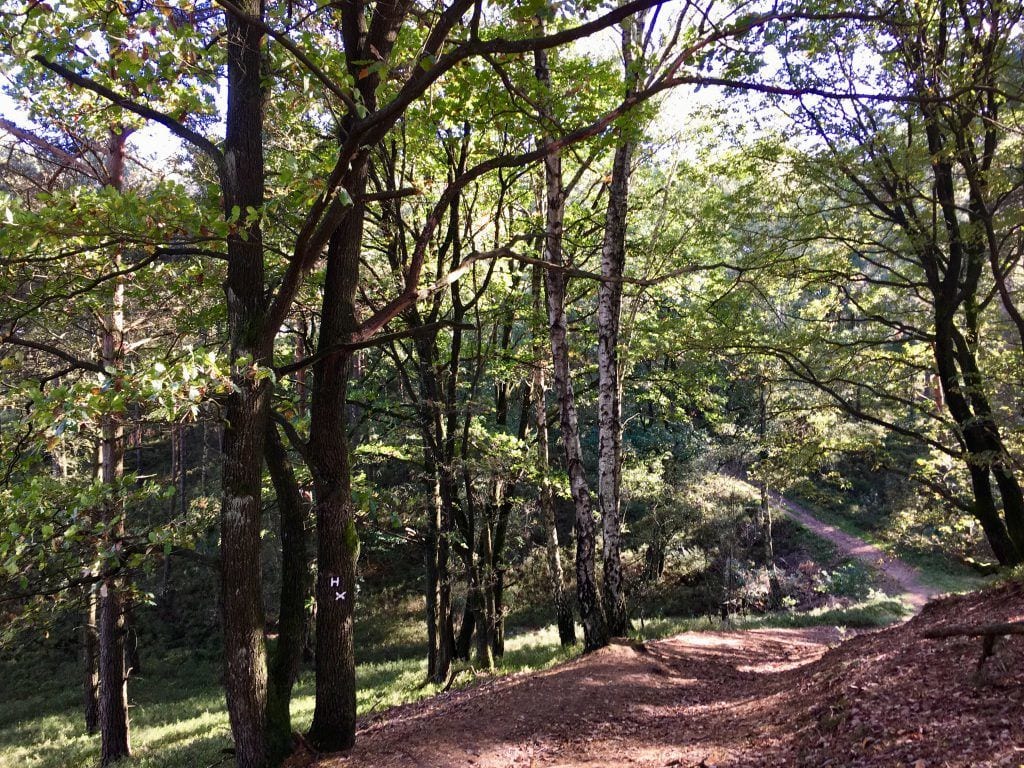 Im großen Bogen geht es um die Siedlung „Tempelberg“ herum und immer weiter in den Wald hinein. Ab und an bietet es sich an, mal einen kleinen Abstecher in einen der noch schmaleren Waldwege zu nehmen. Vielleicht spürt man dabei Beeren oder Pilze auf, oder atmet einfach die frische, erdige Luft! Am Hauptweg geht es jetzt flach aber stetig bergab.