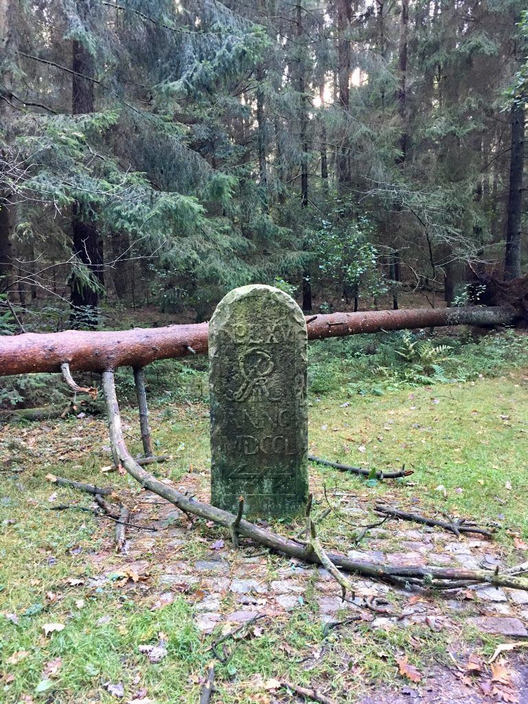 Am „Moisburger Stein„, einem historischen Grenzstein, der frühere Forstgrenzen markierte, geht es nach links, also wieder nordwärts zurück in Richtung Heide. Irgendwann tauchen erste kleine Häuser im Wald auf.