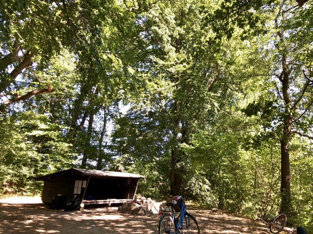 Der Lagerplatz dahinter liegt idyllisch am Feldrand und ist mit Schutzhütte, Plumpsklo und Grillplatz ausgestattet. Wasser war auf einem etwa 250 m entfernten Bauernhof zu bekommen.