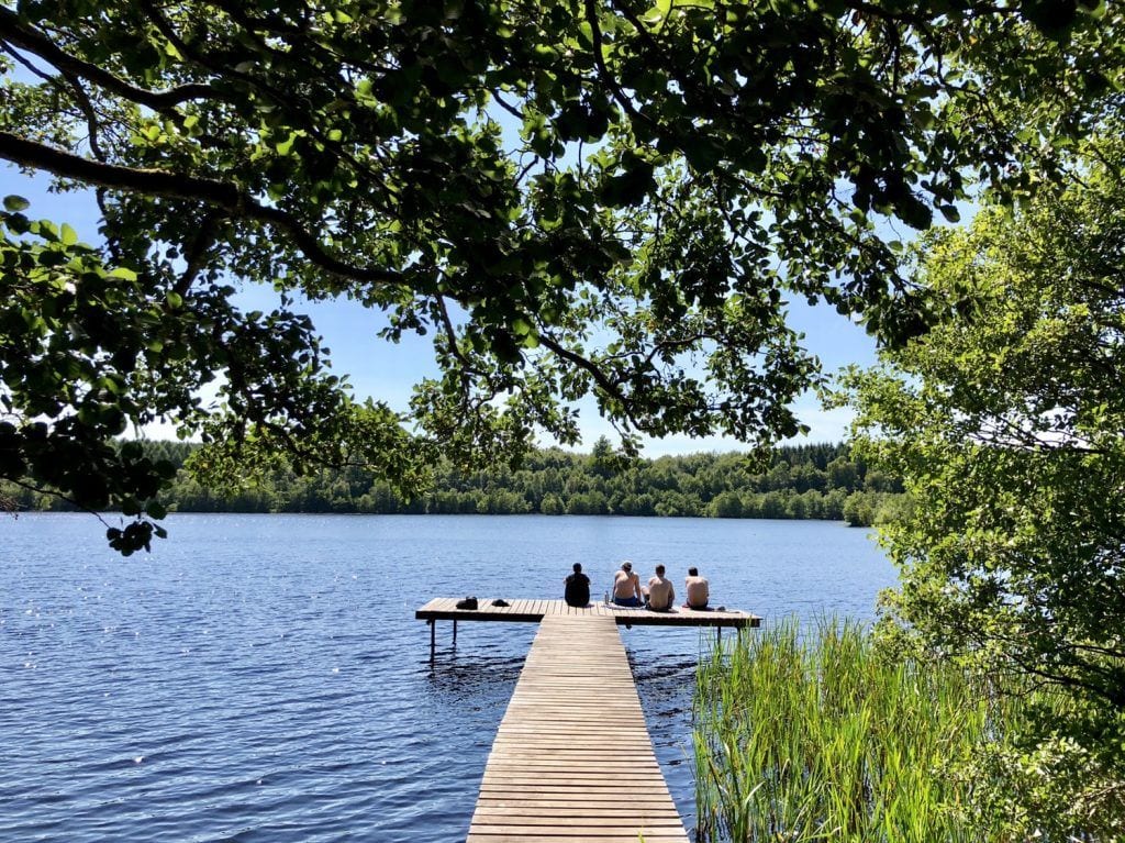 Da kam der wunderbare Eksholmssjön-See am gleichnamigen Lagerplatz im Wald gerade richtig: Umrandet von grünem Wald und blauem Himmel, schimmerte und funkelte dieser verführerisch in der Sonne. Vom nahe gelegenen Steg ging es für uns ins (etwas Cola-artig braune) Wasser, was vermutlich durch den tiefen Schlamm an dessen Grund verursacht wurde. Der See roch zumindest nicht faulig und man konnte super in ihm schwimmen.
