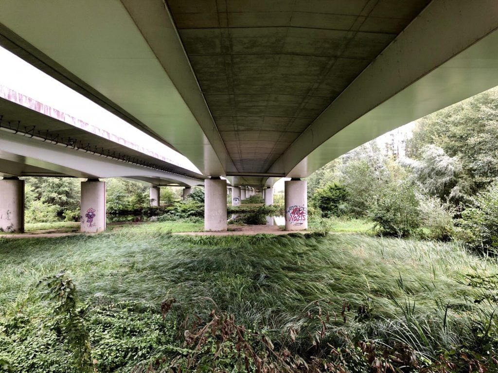 Frisch gestärkt erreichen wir kurz darauf bei Falkenhusen das Naturschutzgebiet Wakenitz und damit bewaldetes Gebiet. Nun geht es in südliche Richtung weiter voran und der Weg windet sich sanft durch flach-welliges Gelände. Östlich von Groß Grönau müssen wir die mächtige Wakenitz-Brücke der Autobahn A20 unterqueren, um dahinter weiter dem Drägerweg zu folgen. Dies hier ist ehemaliges Grenzgebiet zwischen beiden deutschen Staaten, heute bildet die Wakenitz die Landesgrenze zwischen Schleswig-Holstein und Mecklenburg-Vorpommern.