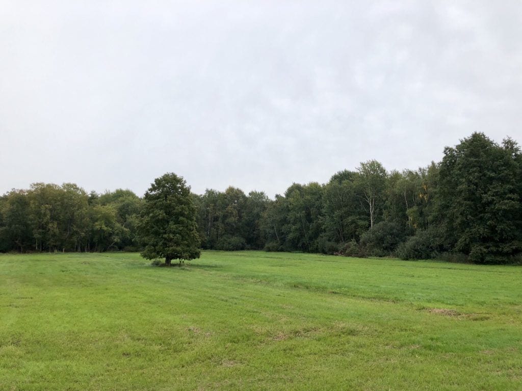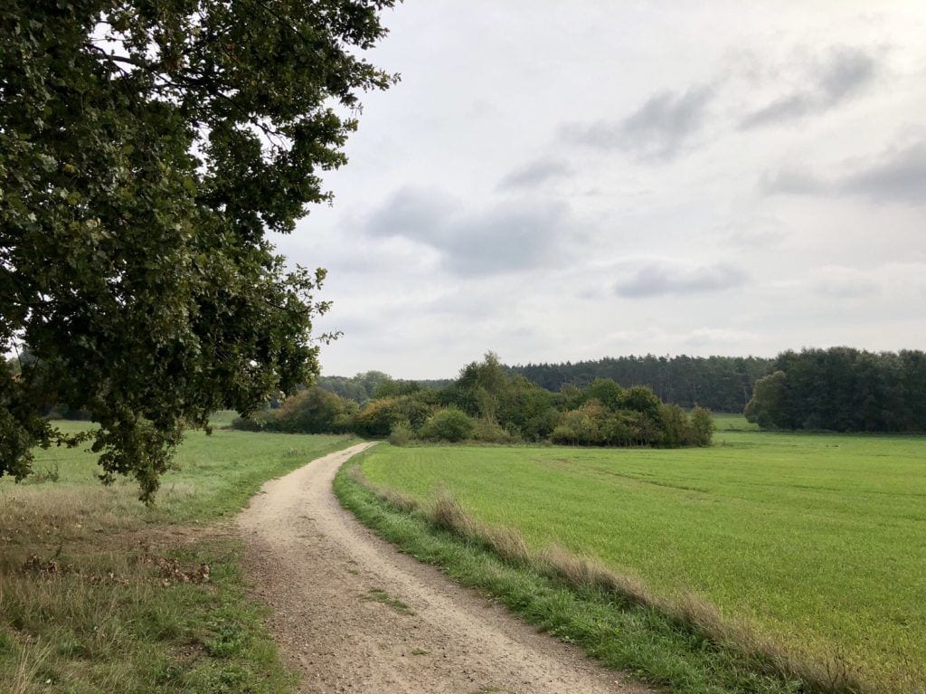 Über Wiesen und Felder verläuft der Wanderweg durch die sanfte Landschaft. Am großen Findling, direkt am Wegesrand und in Rufweite eines großen Bauernhofes, findet sich ein idealer Rastplatz für uns. Als wir hier rasteten war im nahen Rinderstall wohl gerade ebenfalls „Lunchtime“, jedenfalls machten die Rindviecher ordentlich Rabatz!