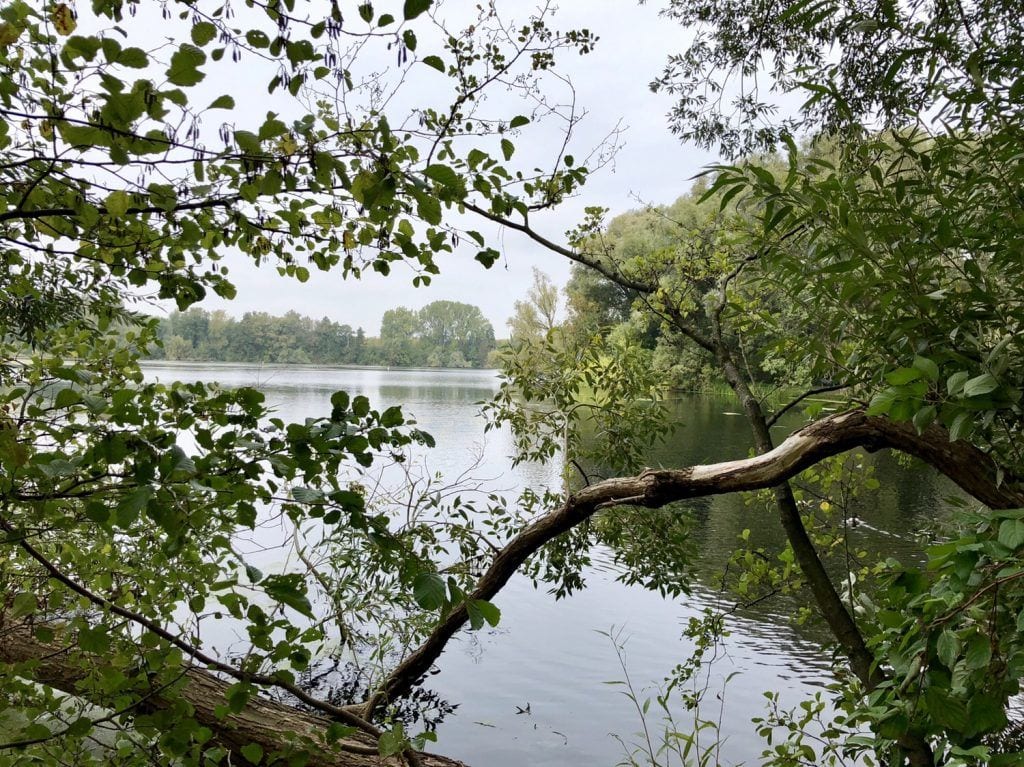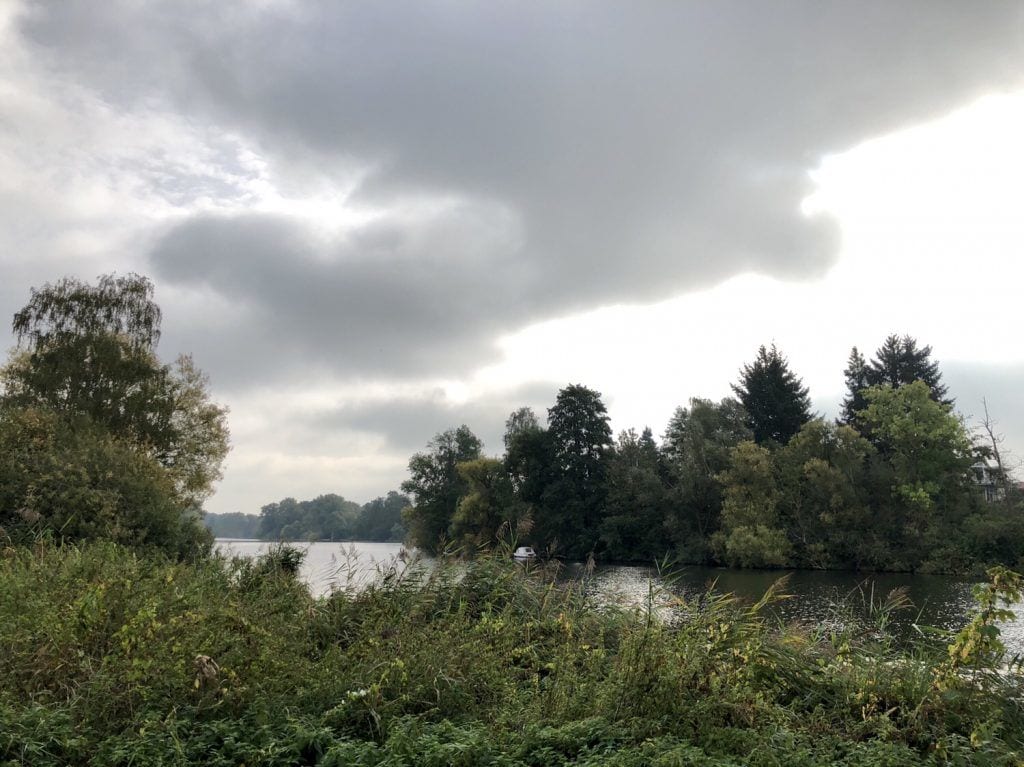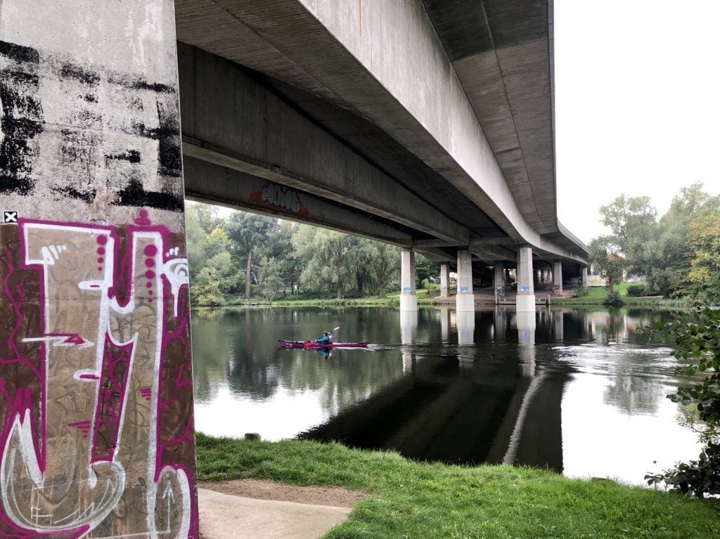 Städtische Bebauung haben wir damit fast hinter uns gelassen, nur eine klobige Straßenbrücke ist noch zu unterqueren, aber wir ahnen schon was jetzt auf uns wartet. Der Fluss biegt und beugt sich vor uns in seinem grünen Saum, mal breit, mal schmaler fließt er uns fast unbemerkt entgegen. Enten und Haubentaucher ziehen entspannt ihre Bahnen, mit Glück entdecken wir den einen oder anderen Reiher im Röhricht oder auf einem der abgestorbenen Bäume am Ufer.