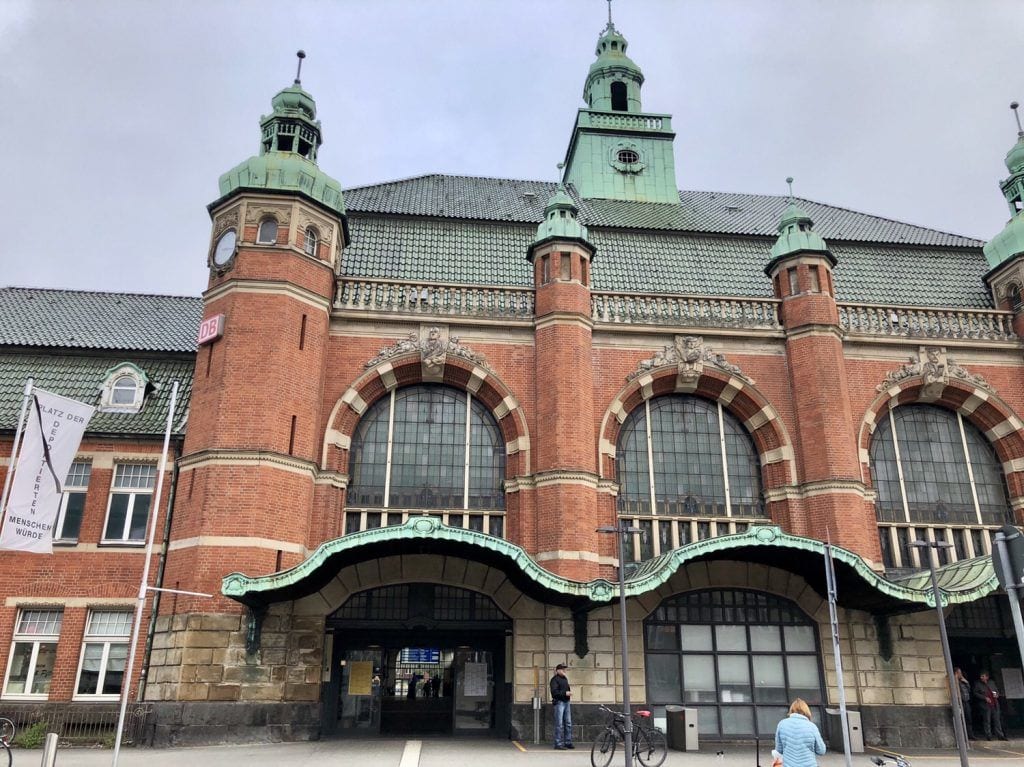 Wir starten am Hauptbahnhof Lübeck und verlassen diesen auf dessen Ostseite. Geradeaus hinter dem Kreisverkehr Lindenplatz erreichen wir schon das zentrale Wahrzeichen der Hansestadt: das berühmte Holstentor! Etwas schief, aber immer noch sehr prächtig steht es da.