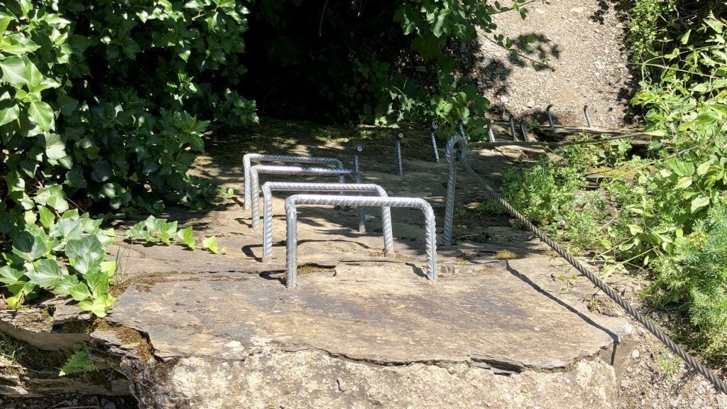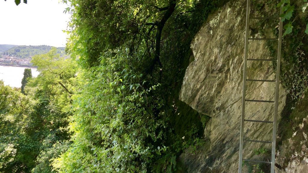 Gleich nach dem o.g. Abzweig folgte eine erste steile Leiter abwärts, sozusagen als Einstieg. Anschließend ging es einen schmalen Wanderweg am Hang oberhalb des Rheins entlang, bis die nächste Schikane aus Leitern folgte.