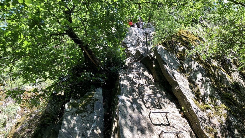 Es folgte eine letzte (was wir hier noch nicht wussten) Klettersteig-Passage im Wald, die fast senkrecht einen Felsen hinauf führte und hauptsächlich aus in den Fels eingelassenen Stahlsprossen bestand. Der Adrenalin-Spiegel stieg wieder ordentlich an, aber auch dieses Vergnügen wahr allerdings schnell wieder vorbei.