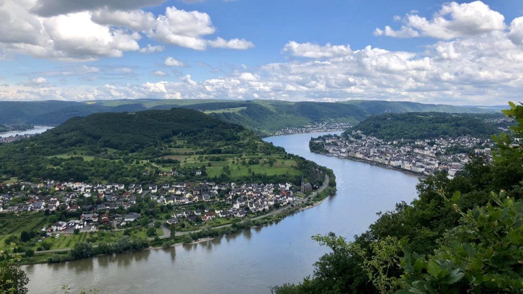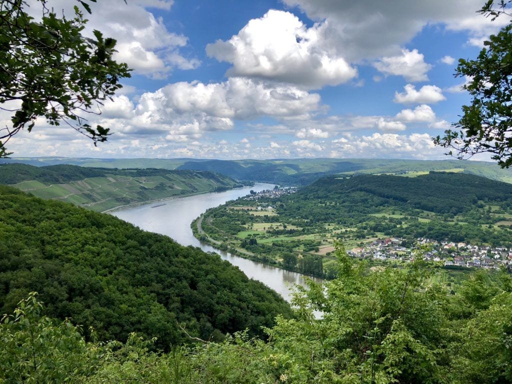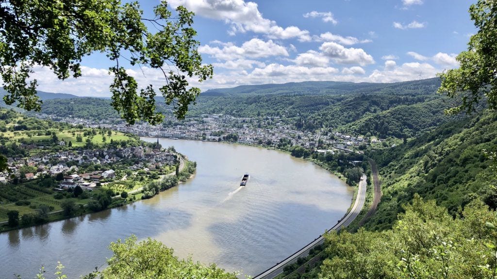 Leider hielt dieser Zustand nicht lange an, denn der Kletter-Abschnitt war ebenfalls recht kurz. Er wurde schnell wieder von einer reinen „Geh-Passage“ abgelöst, die es Höhen-technisch aber in sich hatte, d.h. es ging steil bergan! Nach und nach erklommen wir den Rheinhang. Nebenbei hatten wir immer fantastischere Ausblicke auf die Rheinschleife, die Stadt Boppard und das umliegende Gebiet – herrlich!