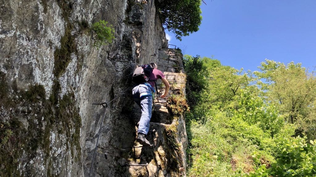 Diese waren mal höher und mal weniger hoch und sind für trittsichere Wanderer problemlos zu absolvieren. Danach kam dann endlich eine Passage, die etwas mehr Koordination und tatsächliche Sicherung erforderte, denn nun ging es für einige dutzend Meter über Stahlsprossen und Tritte an der Felswand entlang und empor. Der Spaßfaktor stieg bei uns!