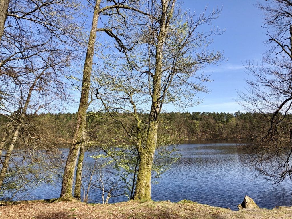 Zunächst geht es hinein in einen recht lichten Laub- und Mischwald, der an diesem Tag herrlich hellgrün strahlte, denn der Frühling war endlich in Norddeutschland angekommen.