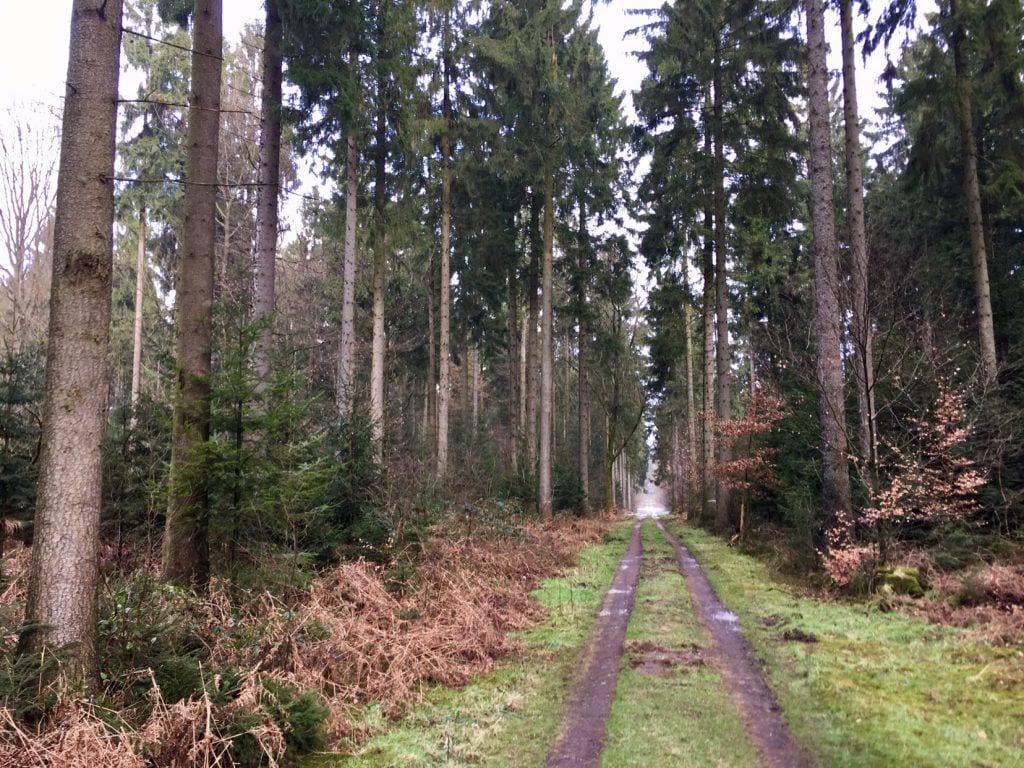 Auf erstaunlich geraden Waldwegen geht es jetzt straff nach Norden. Links und rechts des Weges dicke, alte Fichten, die sich im Wind wiegen. Je weiter man geht, desto lauter ist das Rauschen der nahen Autobahn A1 zu hören, die man nach etwa 9,5 km überquert. Schnell weiter und zurück in die Stille des Waldes!