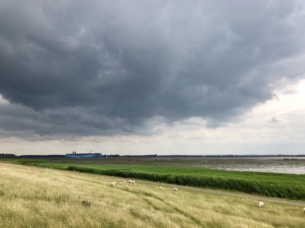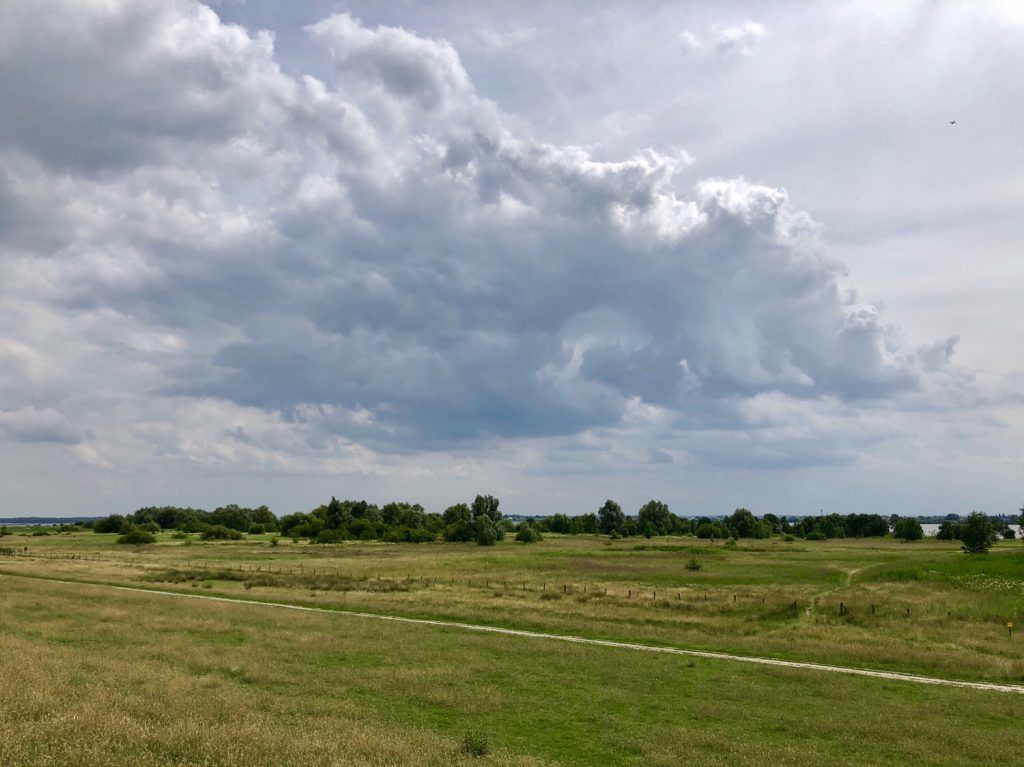 Richtung Südosten ging es nun auf dem Elbdeich stramm voran, allmählich machten sich – nach knapp 20 km Fußmarsch – unsere Füße bemerkbar. Für Ablenkung sorgten die schöne Landschaft um uns herum sowie der an diesem Tag spektakuläre Wolkenzirkus am Himmel. In der Ferne kündigte sich zudem Regen an, was unseren Schritt weiter beschleunigte.