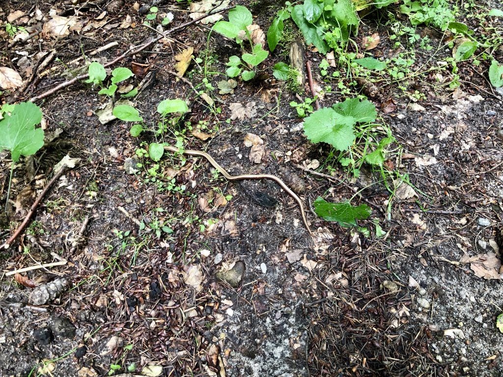 Unser erstes Zwischenziel war ein idyllischer Aussichtspunkt am östlichen Rand des Werders, von dem aus man den westlichen Schaalsee gut überblicken können würde (siehe Titelbild). Auf dem Weg dorthin überraschten wir eine kleine Blindschleiche, die sich auf dem Wanderweg aufzuwärmen versuchte…